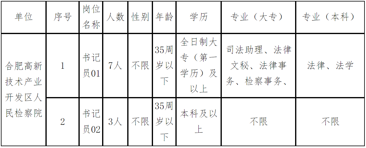 因工作需要,现公开招聘合肥高新区人民检察院政府购买服务岗位共10名。现就有关事项公告如下: