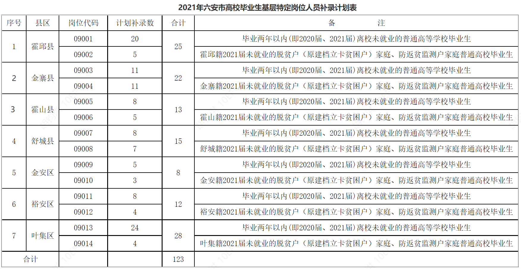 附表:2021年六安市高校毕业生基层特定岗位人员补录计划表
