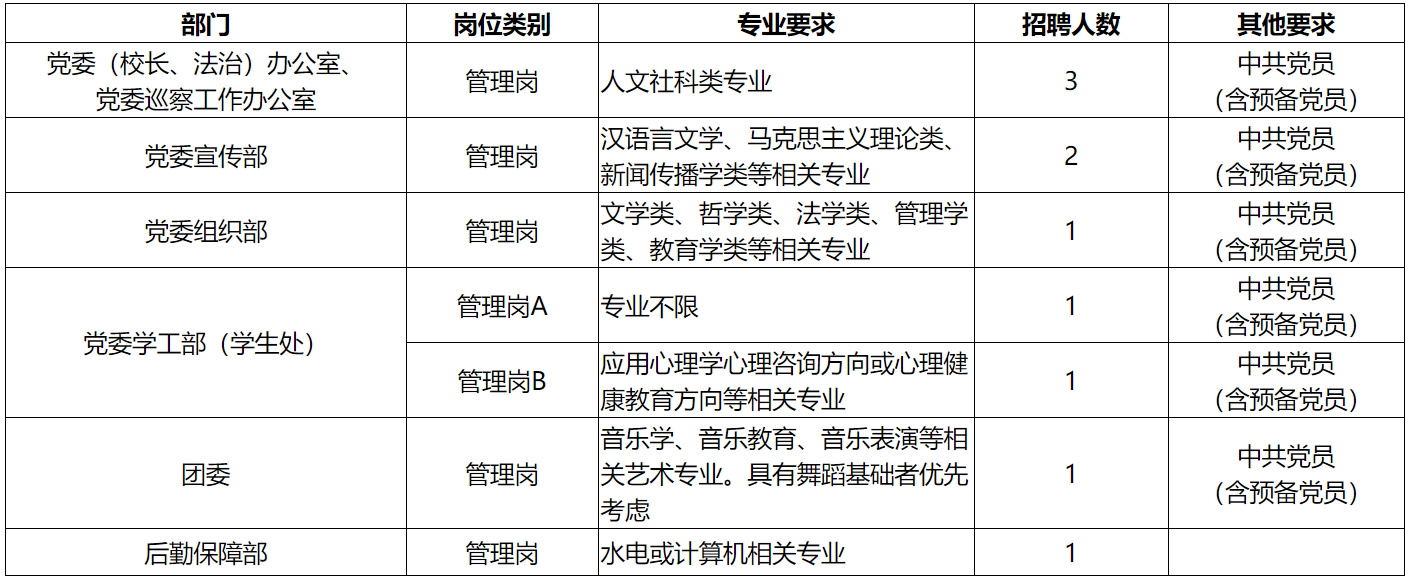 因学校事业发展需要,根据《事业单位人事管理条例》(国务院令第652号)、安徽省人力资源和社会保障厅、安徽省教育厅《关于进一步做好省属高校公开招聘工作的通知》(皖人社秘〔2018〕369号)精神,现面向社会公开招聘管理岗位工作人员10人,现将有关事项公告如下: